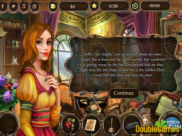 Lar oss leker ny å underholding gjemte Objekt spill under tittelen Den Gyllene Elixir. Argelias søster Grisel har vært syk i månedsvis og ingen vet hva å gjøre. Dag om dagen får hennes forhold verre. Doktorer sier det er bare enveiskjørt å spare piken – den Gyllene Elixir ! Etter at hun drikker det som hun blir spart. Kommer du til å hjelpe Argelia drar og finner den kostbare elixir ? Da start din reise akkurat nå ! Undersøk plasseringene, saml forskjellig ting, vær så oppmerksom som mulige fordi det menneskelige livet er i din hender. Lek Den Gyllene Elixir på vårt sted for fri og ha moro.